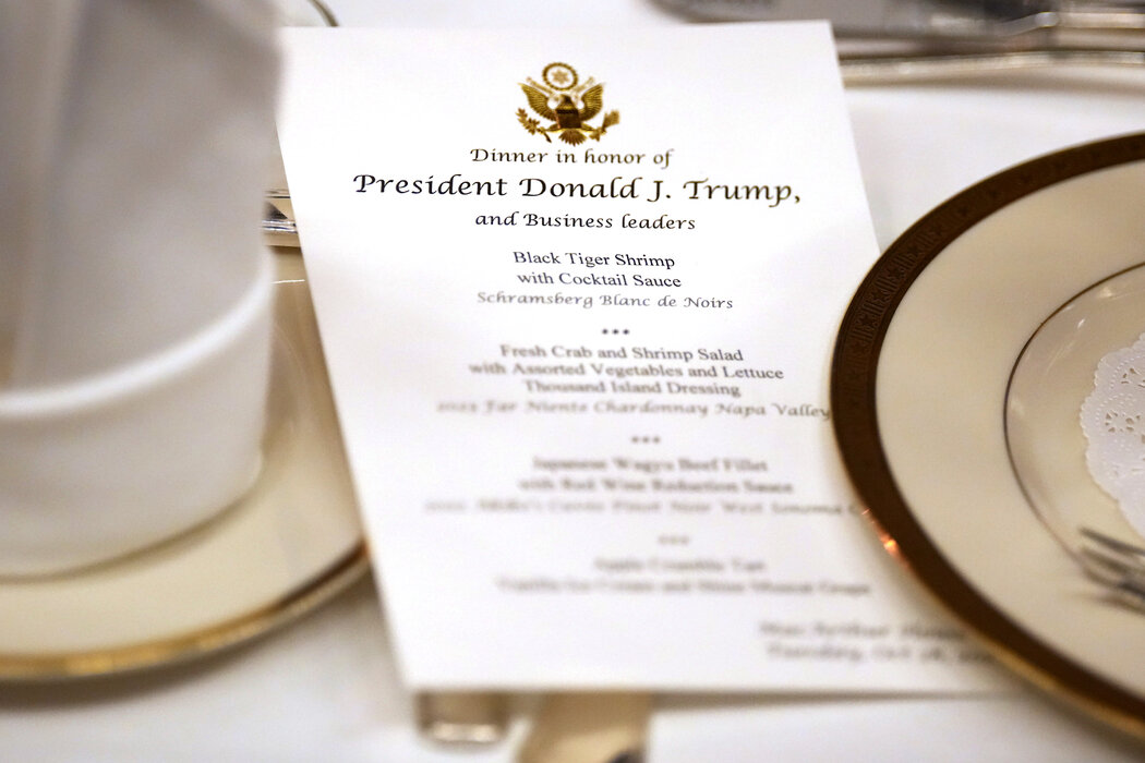 周二在美国驻东京大使官邸举行的晚宴菜单,该晚宴招待了川普总统及商界领袖。 Andrew Harnik/Getty Images