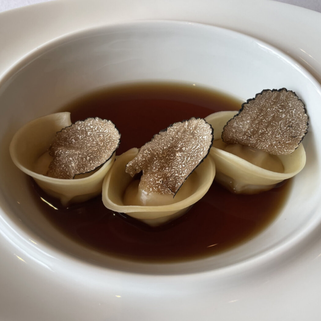 周三晚餐上的韩式乌鸡饺子、牛肝菌清汤配松露。 South Korean presidential office
