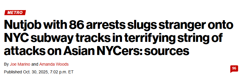 据10月30日报道,警方及消息人士透露,近日,一名累计被捕达86次的男子在连续发动5起无差别反亚裔袭击事件的过程中,在曼哈顿地铁站将一名陌生乘客打到了铁轨上。