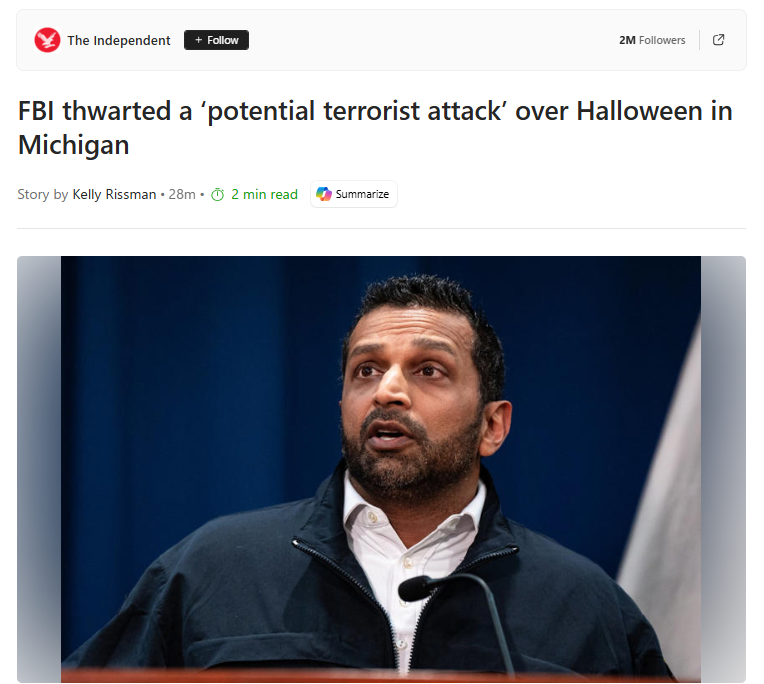 据联邦调查局局长卡什·帕特尔称,联邦调查局挫败了一起计划在密歇根州万圣节周末实施的潜在恐怖袭击。