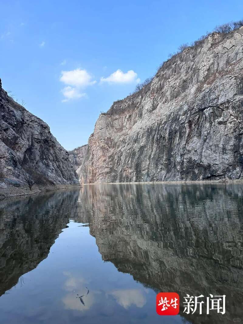 矿坑湖夹在峡谷中间,呈S形,所以这里被大家称为“南京小三峡”。记者来到矿坑湖时,天气短暂放晴,从远处看,湖水是碧蓝色,走到湖边,湖水呈清澈的绿色,非常漂亮,到这里徒步的市民络绎不绝。