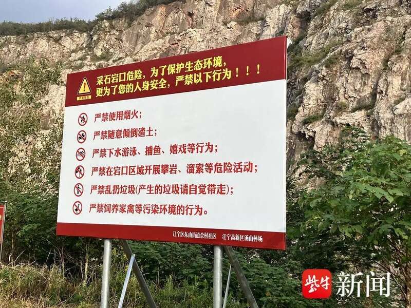10月31日,扬子晚报/紫牛新闻记者来到十里长山凹进行调查,上山的小径入口有一个当地社区和汤山林场联合设立的警告牌,明确规定“严禁饲养家禽等污染环境的行为”。在矿坑湖东岸,也设有同样的警告牌。