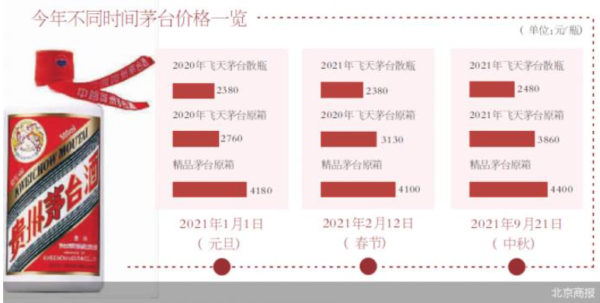 对比2021年的价格,飞天茅台价格已经腰斩。当年9月21日,飞天原箱曾出现过3860元/瓶;据四川在线2021年8月5日报道,一位酒商销售人员告诉记者,“散装的茅台2850元一瓶,不含税钱。”