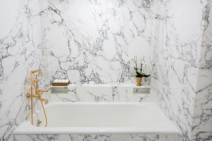 这间浴室原本以装饰艺术风格的绿色瓷砖为特色,现在铺满了延展的黑色与白色大理石,并配有金色的卫浴设备。