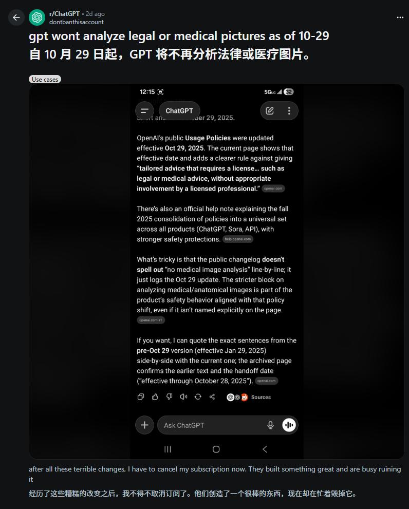 一位 Reddit 用户“bhannik-itiswatitis”评论称:“ChatGPT 在法律事务方面的表现非常出色,我从中受益良多,节省了大量费用。也许正因如此,他们才要收紧这方面的功能。”