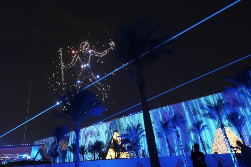 大埃及博物馆1日举行开幕式,无人机排出古埃及人物图桉。(美联社)