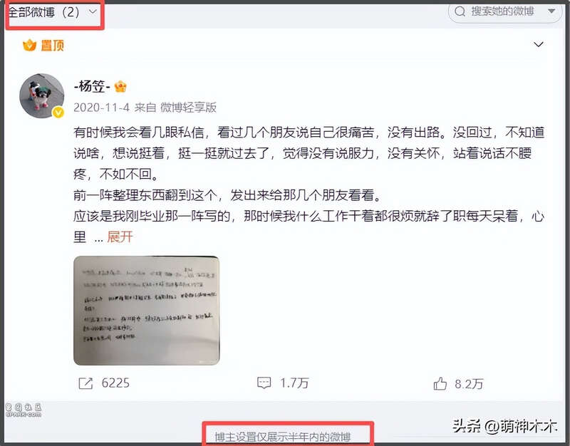 打开杨笠的微博,会发现她设置了半年可见,置顶内容是2020年发布的一篇感想文,提到自己在求职期间遭遇的难关和痛苦,但一切都终将向好,挺一挺就过去。2020年正是杨笠因为“普信男”名句走红的一年,完全表达了她的心境变化。注意看的话,会发现提示框显示全部微博条数为“2”,说明她删除了大部分微博,只保留了2条。
