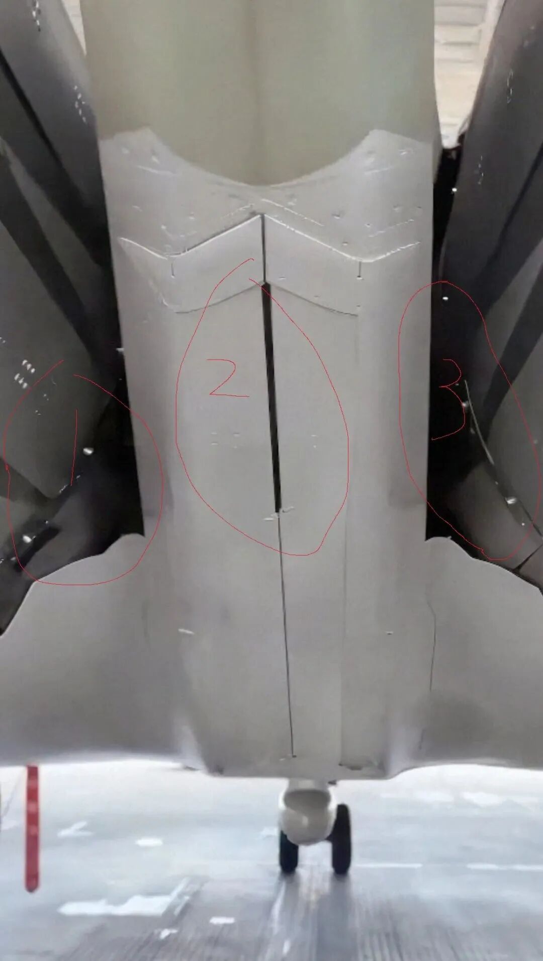 这是歼-35舰载机的尾椎,可以看到,上下缝隙不同,下面密封很好,上面一个大坑,酷似苏57,手指都可以塞进去,而且大家可以看到,大坑的上下还不一样,下面窄,上面宽,这个偏差非常明显,在CNC技术普及的今天要做成大的偏差还必须有点技术水平。