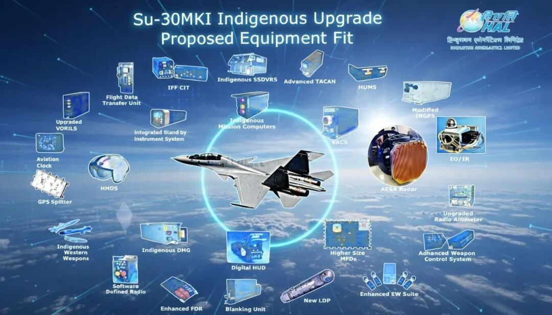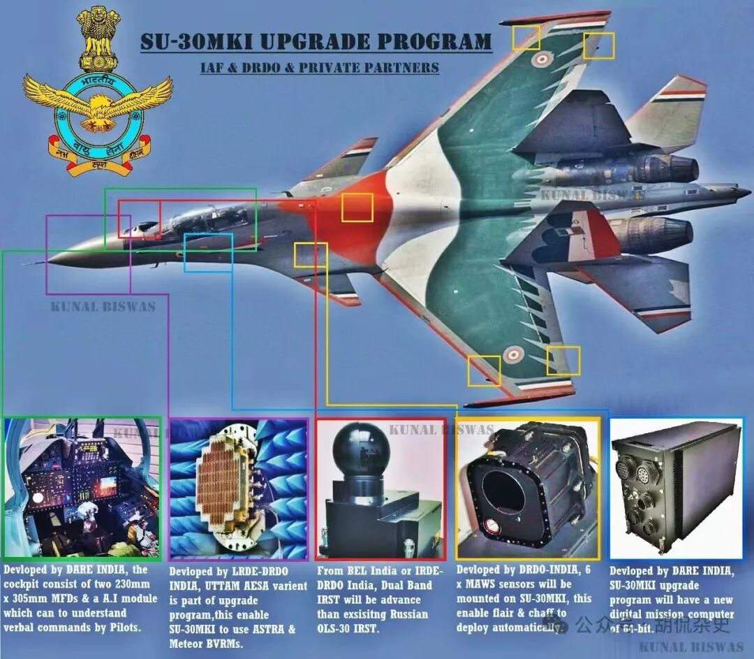 这是三哥HAL搞得苏30MKI战斗机改进项目,看得到的是座舱变2大屏幕230X305mm,AI语音技术(三代半时代大家都搞了语音换频率,导航点这些,别的功能都怕出错,禁了,比如发射导弹),发动机换自制的UTTAM AESA雷达,可以发射本国制造的ASTRA 123导弹,还有流星导弹(但是欧洲人能随便给他们导弹核心代码和包线吗?很值得怀疑),前视红外系统也升级了,导弹告警系统升级,还有64位数字任务计算机。