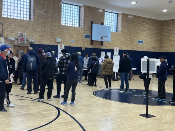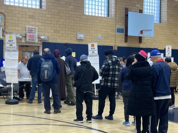 2025年11月4日,大批选民前往法拉盛214小学投票站踊跃投票。(林丹/大纪元)
