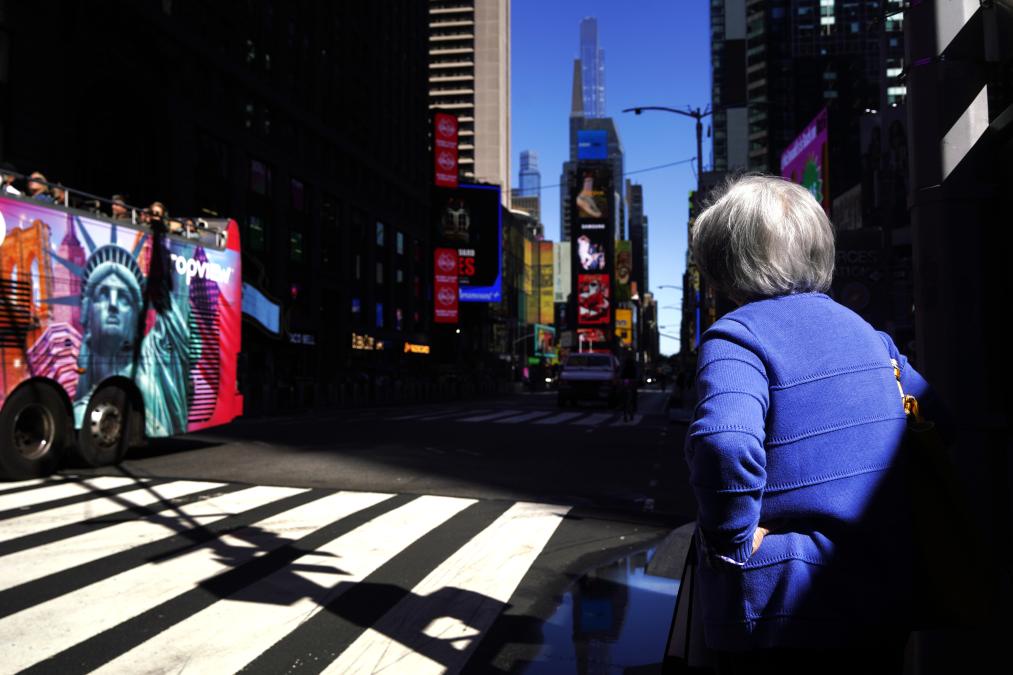 10月1日,在美国纽约曼哈顿的时报广场敖近,行人等待通过人行横道斑马线过马路。新华社记者 吴晓凌 摄