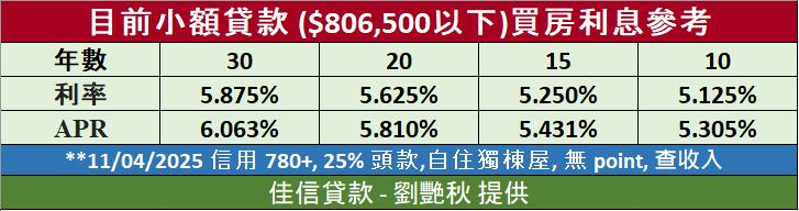 11月3日当周,佳信贷款提供的30年期固定抵押贷款利率为5.875%。(佳信贷款-刘艳秋提供)