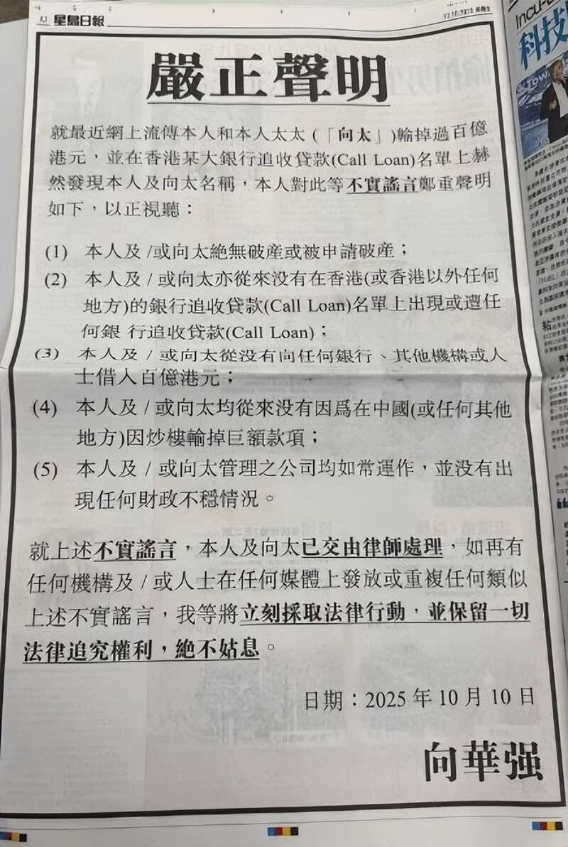 对此,向华强在10月10日通过香港媒体发布五点严正声明,否认破产传闻,并表示将召开记者会澄清。声明中明确:夫妇俩绝无破产或被申请破产、未被任何银行追债、没有百亿借贷、没有炒楼巨亏、公司运作如常。这种罕见的强硬姿态,与向太日常在社交平台分享八卦的轻松形象形成鲜明对比——或许正是这种反差,让部分观众觉得其回应“不够严谨”。