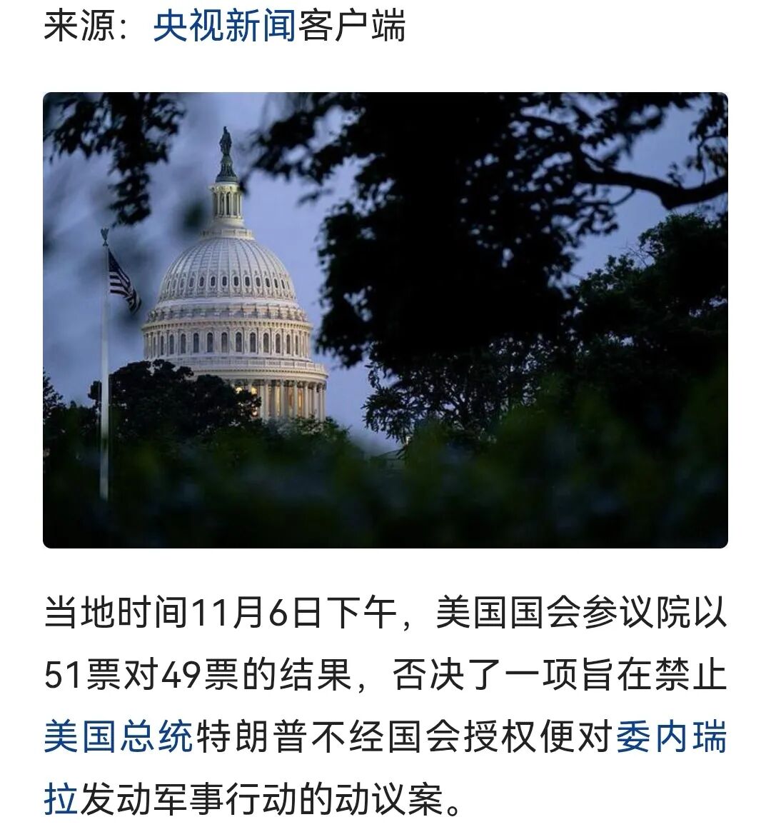 美国突然间讲“法律”了,估计大家和我一样,有点别扭,美国时间11月6日(相当我们7日),参议院投票否决了美国总统不经过国会授权“空袭”委内瑞拉。其实,我们知道,共和党目前在参议院是多数党,而参议院却否决了,背后很可能是共和党自己做的“台阶”,因为委内瑞拉总统公开“请求”中国帮忙,这是川普非常害怕的事,“引东方火力”到美国“南花园”就麻烦了。