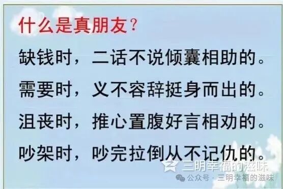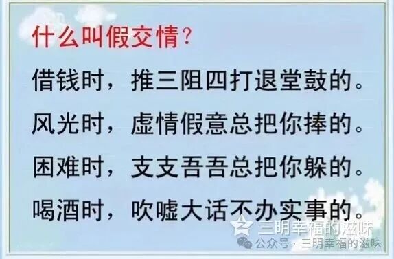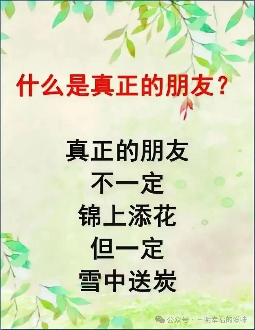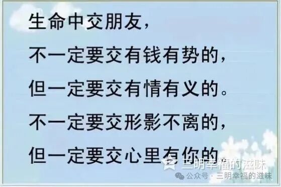 在这个物欲横流、利益交换的智能时代,咱不一定要交有钱有势,但一定要交有情有义的。不一定要交形影不离的,但一定要交心里有数的。同时,一定要远离借钱时推三阻四打退堂鼓的;风光时虚情假意把咱捧得;困难时支支吾吾把咱躲得;喝酒时吹嘘大话不办实事的……