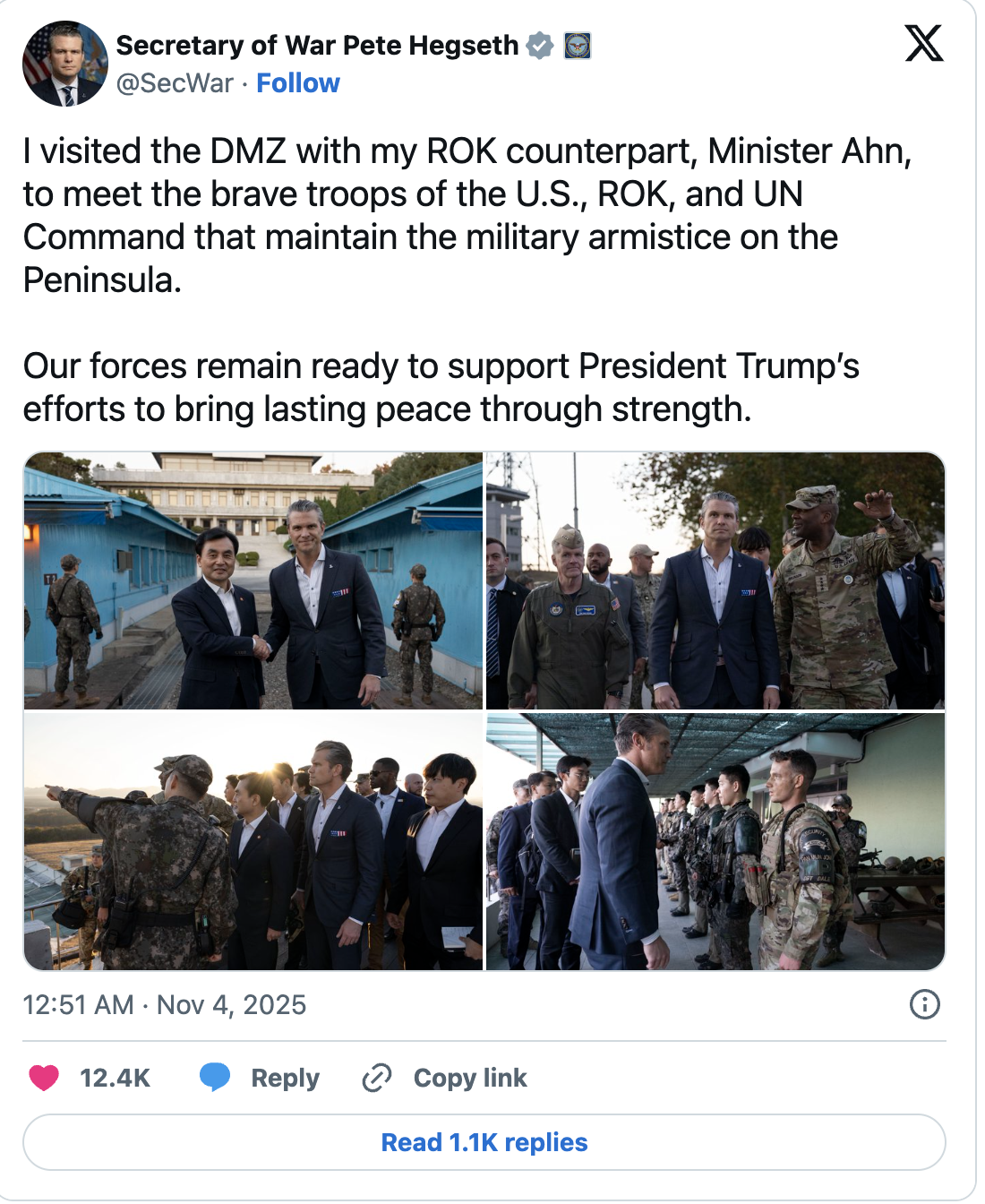 本周在韩国参加安全协商会议会谈期间,赫格塞思在社交媒体上发布了几张他访问朝韩非军事区的照片。
