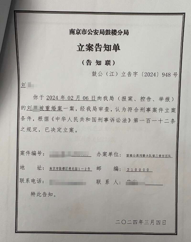 2024年3月,南京市公安局鼓楼分局立案调查刘晓月被重婚案。
