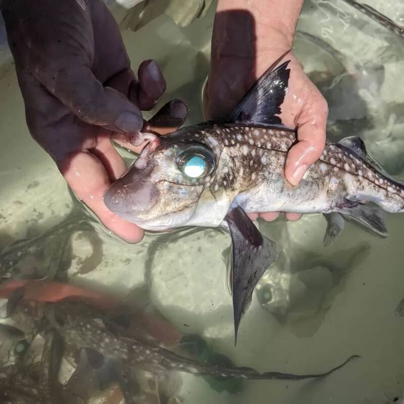 其中,有些银鲛的尾巴细长,因而有鼠鱼之称。其中,名为科氏兔银鲛的银鲛是华盛顿州普吉特湾(Puget Sound)里数量最多的鱼类之一。这种鱼身上布满了白色的斑点,通常被称为斑点鼠鱼(spotted ratfish),是科恩目前主要关注的对象。