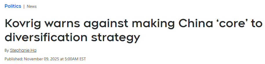 康明凯这番话,正好发生在加拿大总理马克·卡尼(Mark Carney)与中国国家主席习近平在韩国出席亚太经合组织(APEC)峰会期间会面后一周。这是两国最高领导人时隔八年来的首次面对面会谈。