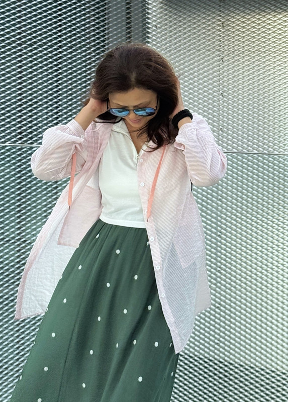 14. 同一条裙子不同的搭配 。天气转凉了,但还穿不了毛衣绒衣,长袖薄衫足够了。