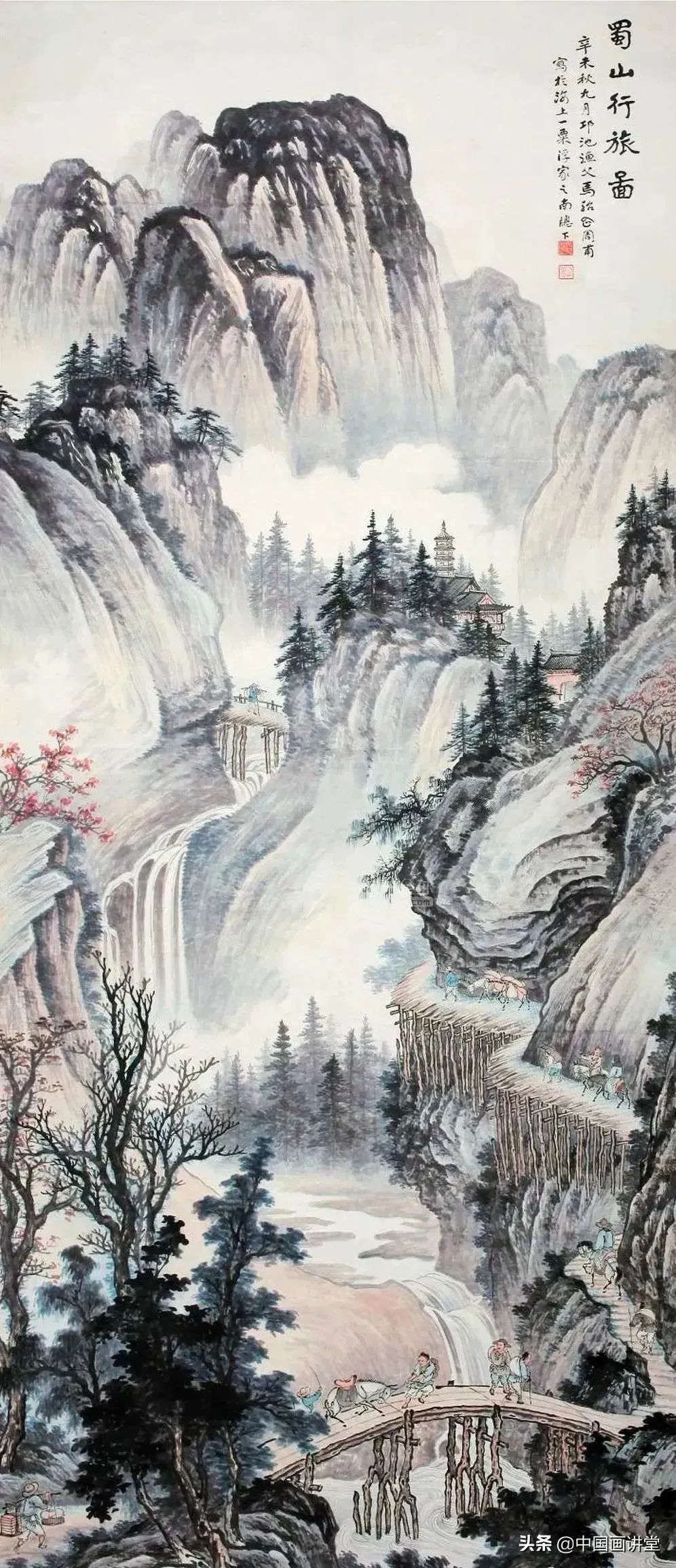 此幅《蜀山行旅图》,作于1939年,张大千时年41岁。这张《蜀山行旅图》在艺术表现手法上更趋于成熟,已经脱离了二十年代他所热衷的八大山人与石涛的粗犷写意之风,颇得唐寅、沈周的细润华滋。