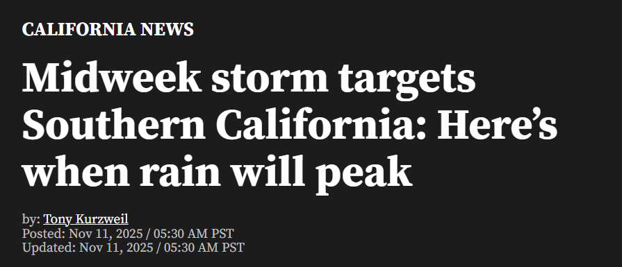 一股中强等级的太平洋风暴正逐渐形成,预计将在11月12日周三登陆南加州,周末前将带来一场强降雨。