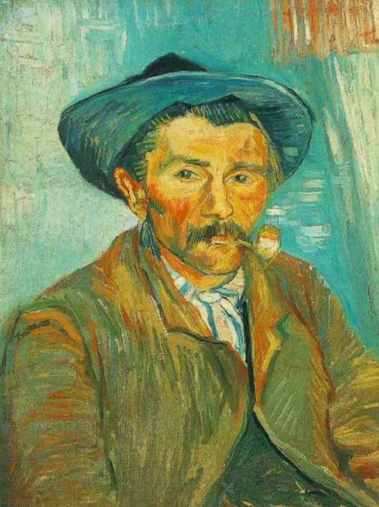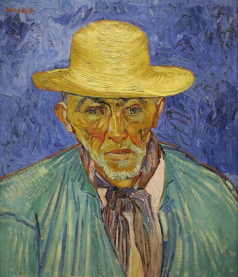 在《带草帽的自画像》(Self-Portrait with Straw Hat, 1887)中,他像个正在户外劳作的农夫,眼睛布满干燥的阳光。他试图让自己成为普通人、劳动者、不是那个“疯子画家”。