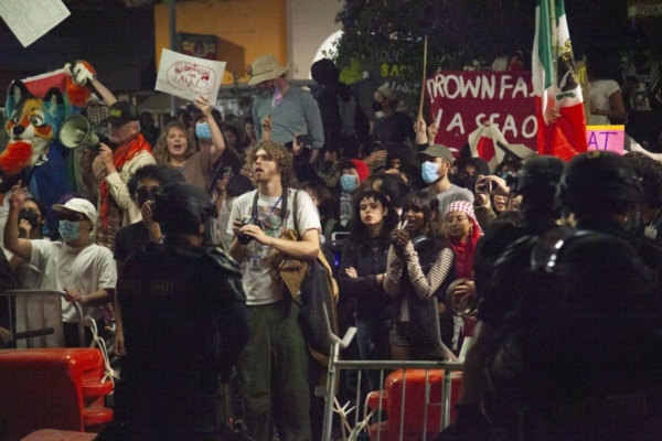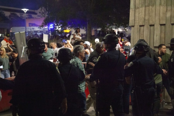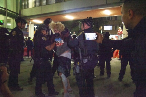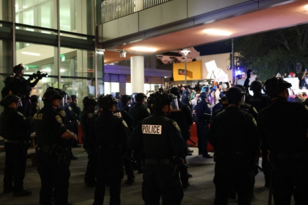 至少数十名加州大学警察(UC Police)和加州高速公路巡警(CHP),在大厅前的广场上严阵以待,上空还有至少三架警用直升机在盘旋。