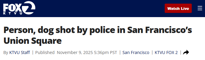 据11月9日报道,周日(11月9日)下午,旧金山联合广场(Union Square)发生一起警察开枪事件,一名男子和一条狗被击中。事发后,当局在调查现场时,繁忙的市场街(Market Street)部分路段被临时关闭。