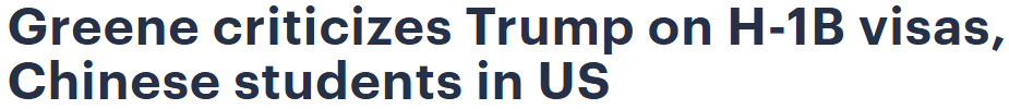 乔治亚州共和党众议员玛乔丽·泰勒·格林(Marjorie Taylor Greene)周三在社交媒体上再次公开批评川普关于H-1B签证和外交政策方面的言论。