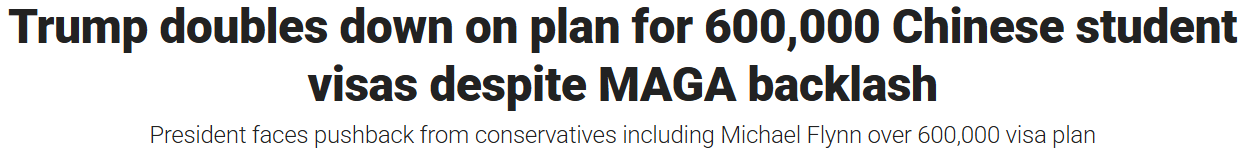 多位MAGA派人物也在社交媒体上批评川普为H-1B签证辩护,并反对他在英格拉汉姆采访中呼吁更多中国学生来美留学的言论。