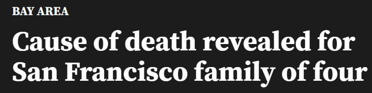 据KRON4周三获得的旧金山首席法医办公室验尸报告显示,在10月8日于旧金山一处高档住宅内发生的一家四口“灭门案”中,一人系自杀,另外三人系他杀。