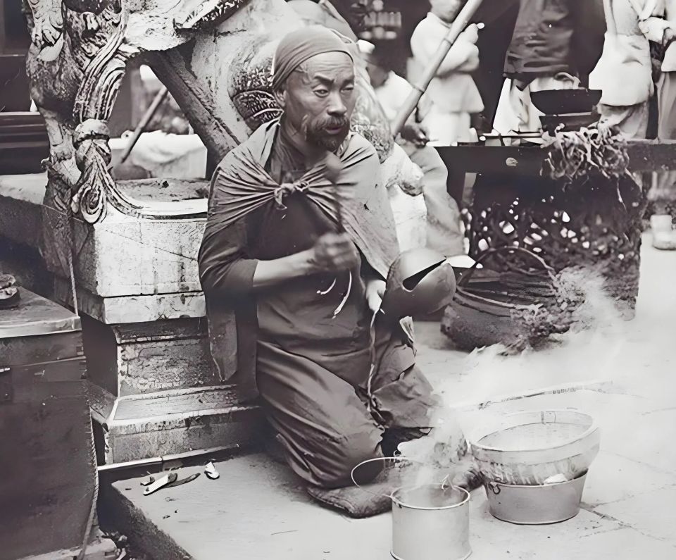 晚清时期上海的城隍庙附近,一个60岁老汉敲木鱼跪地乞讨的乞丐