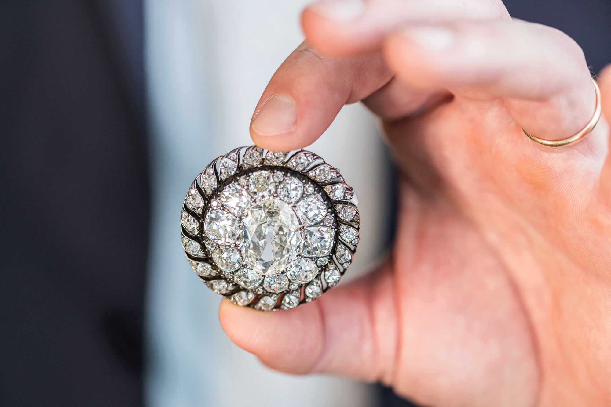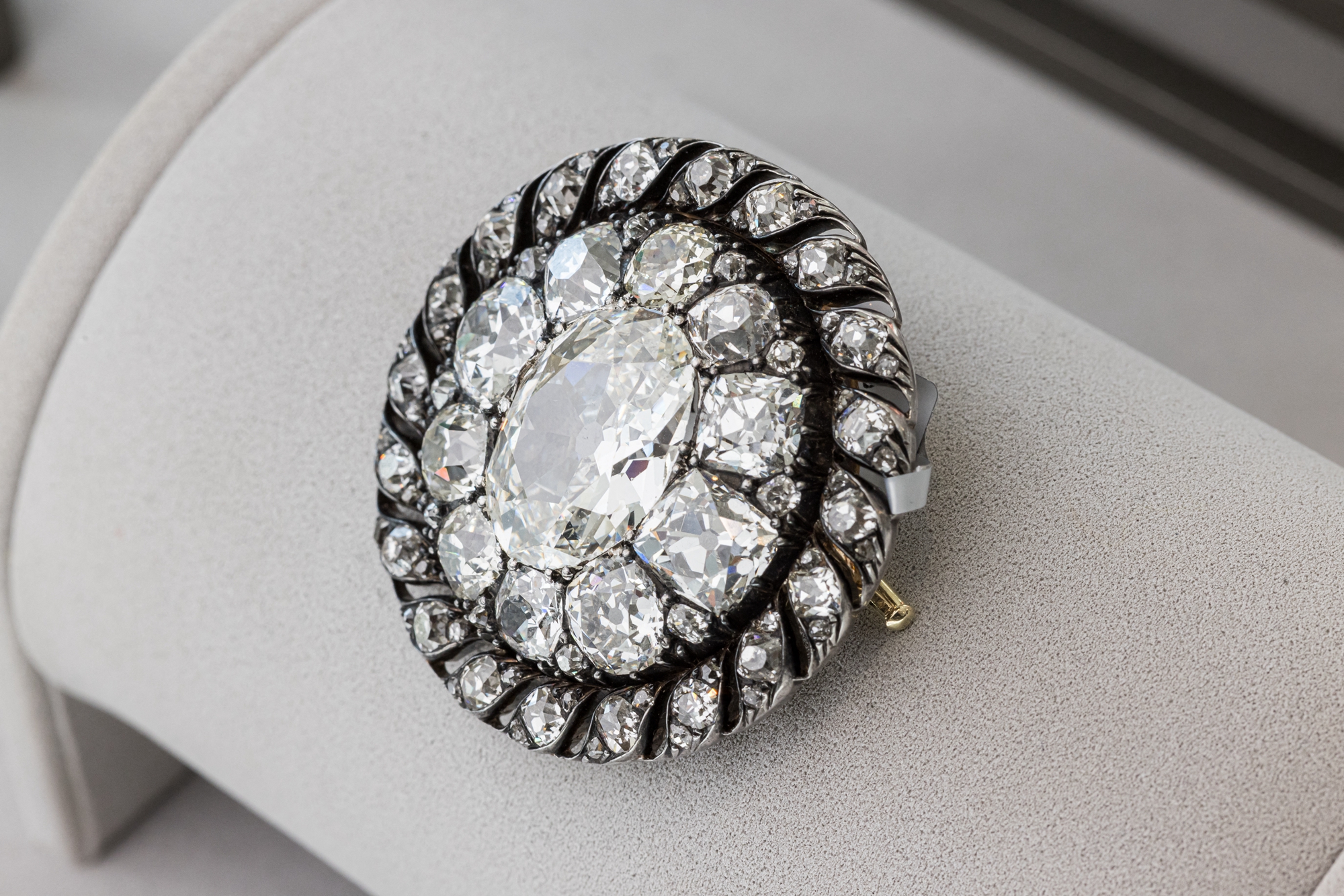 这枚银白色的圆形胸针兼具胸针与吊坠功能,中间镶嵌着一颗超过13克拉重的椭圆形钻石,周围环绕着近百颗切割精致的小钻石。过去两个多世纪以来,这枚胸针一直被普鲁士王室霍亨索伦家族当成传家宝。