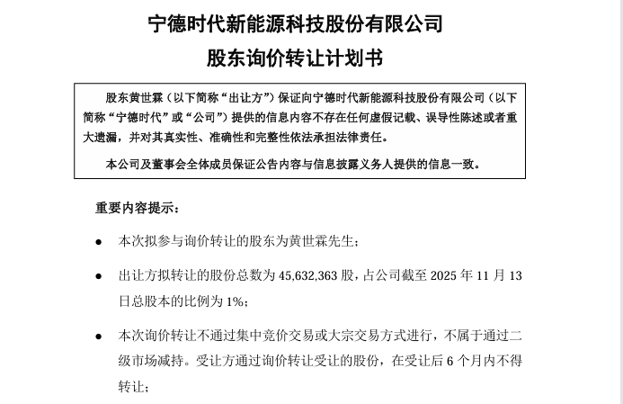 宁德时代14日在其发布的《股东询价转让计划书》中透露:“本次拟参与询价转让的股东为黄世霖先生;出让方拟转让的股份总数为45,632,363股,占公司截至2025年11月13 日总股本的比例为1%;本次询价转让不通过集中竞价交易或大宗交易方式进行,不属于通过二级市场减持。受让方通过询价转让受让的股份,在受让后6个月内不得转让。”“转让原因为自身资金需求。”
