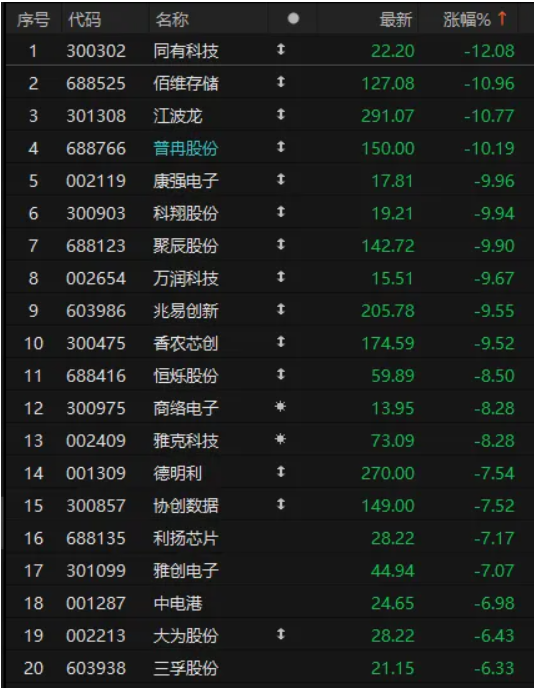 11月14日,A股存储芯片板块大跌,佰维存储、江波龙、普冉股份等多只个股跌幅超过10%;跌幅超过7%的个股也多达13只。