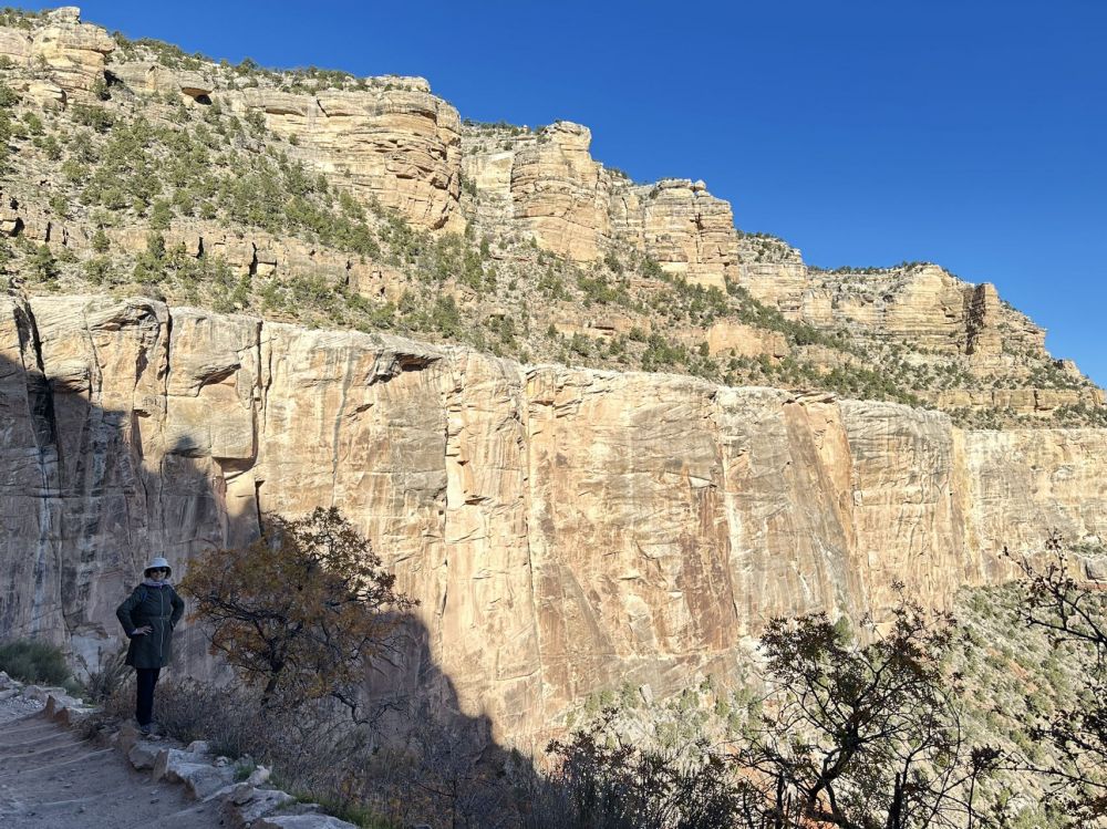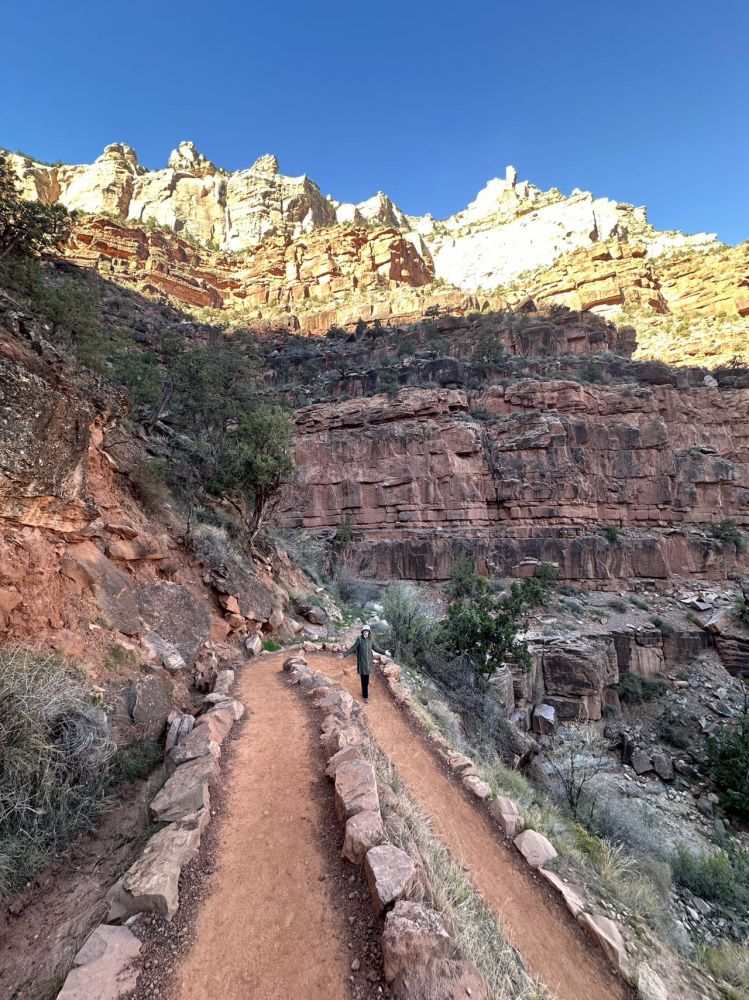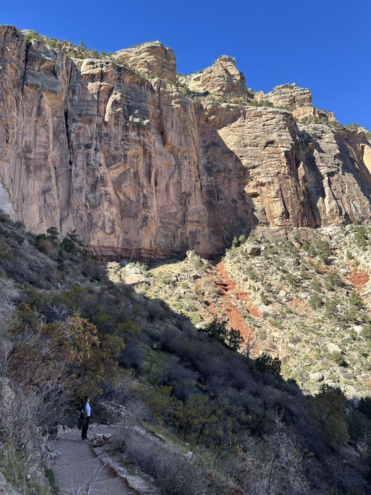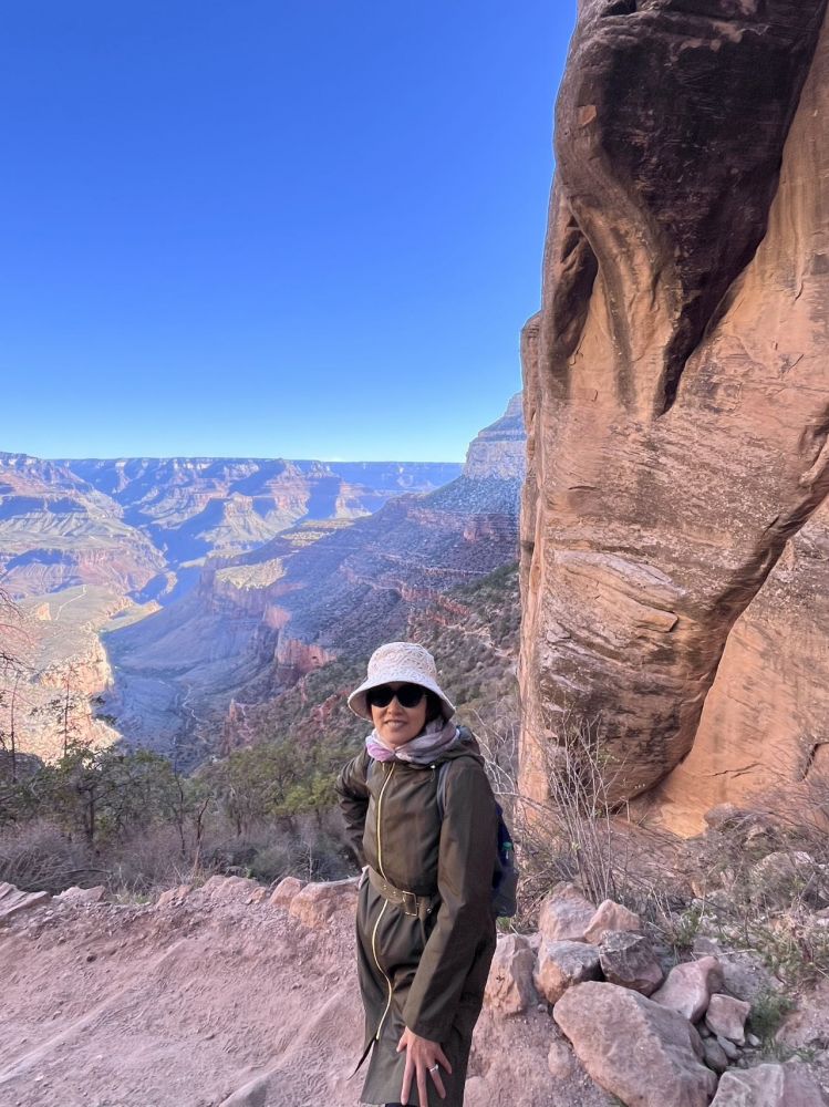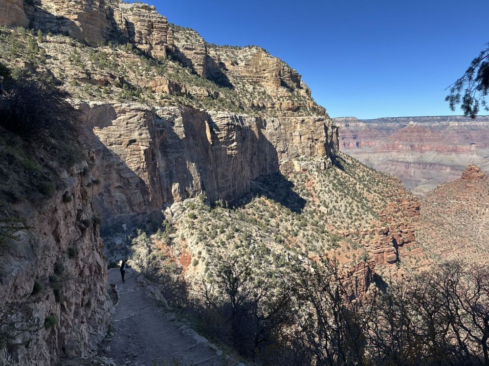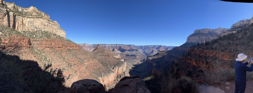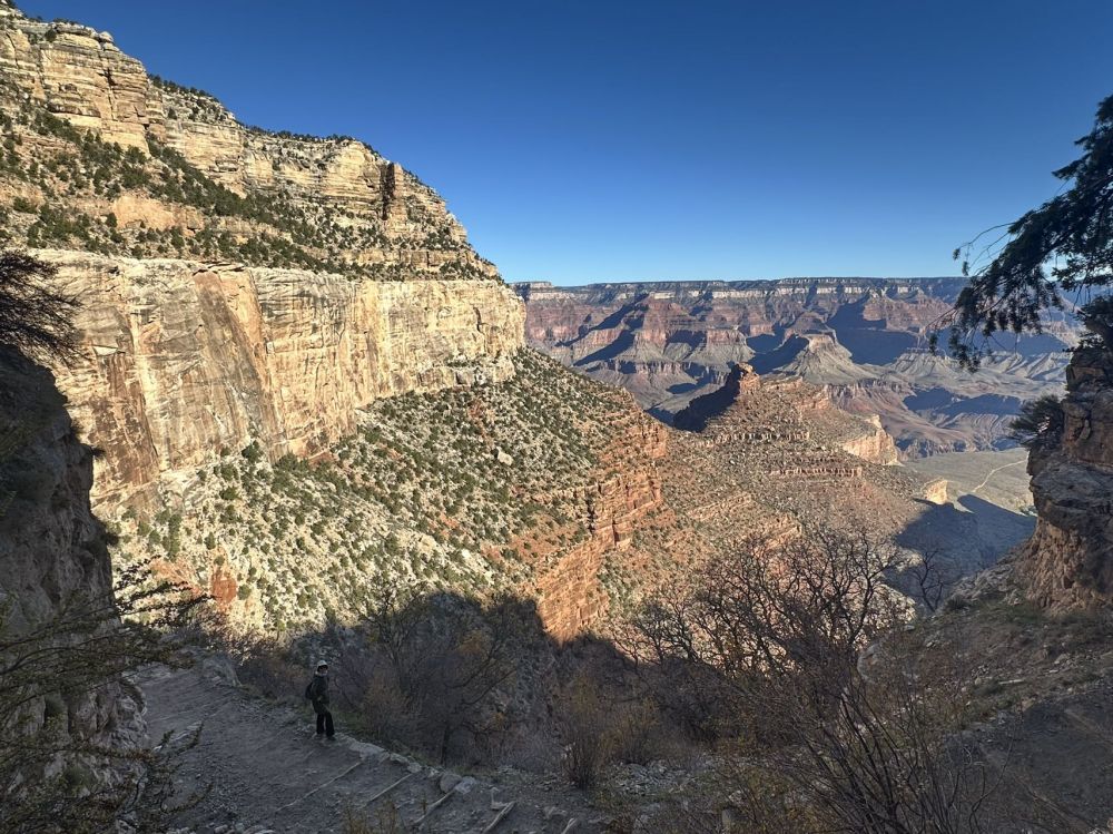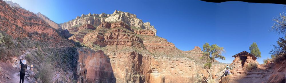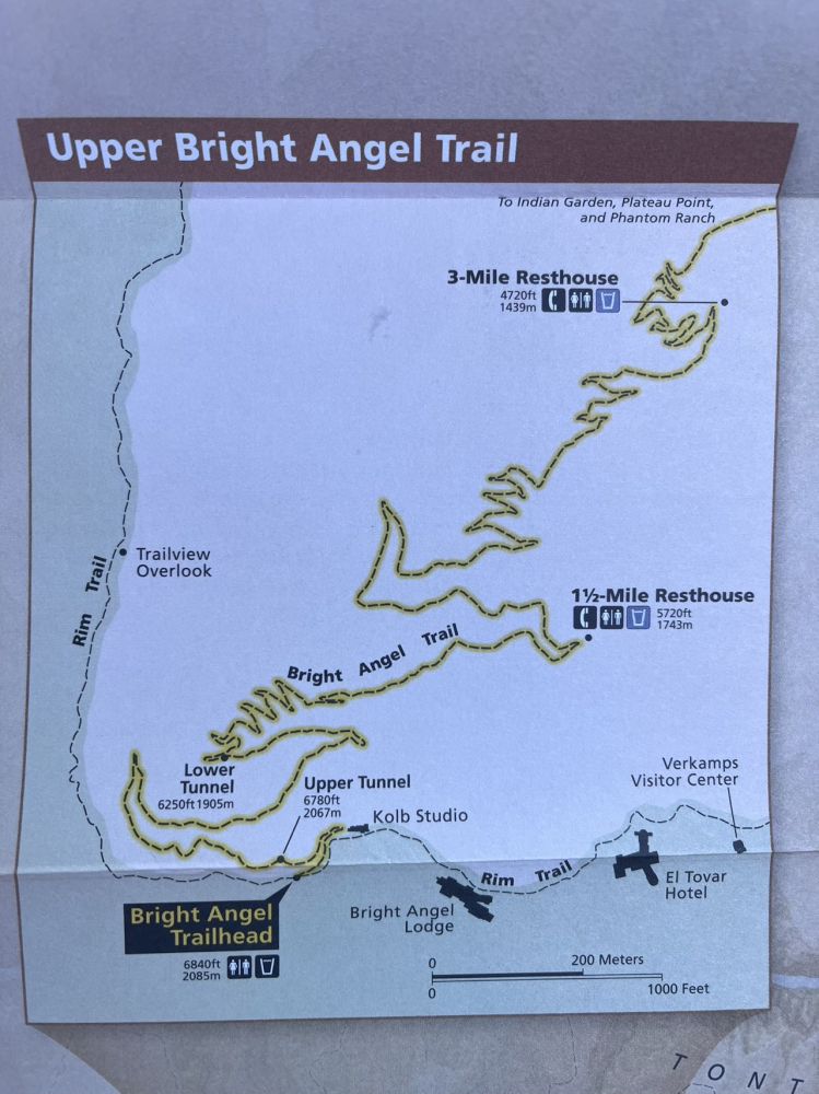 古人云:“欲穷千里目,更上一层楼。”如果同一位诗人与大峡谷相遇会不会说:“欲探百里深谷,且下三里崎岖!”第一天,看罢日出,吃完早餐,咱们完成了Bridget Angel Trail的三英里trail,a tremendous milestone!这基本上是徒步素人可以走的极限了,往返6英里/10公里,下降海拔高度650米左右。