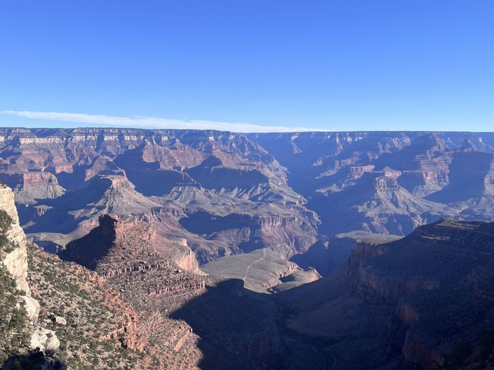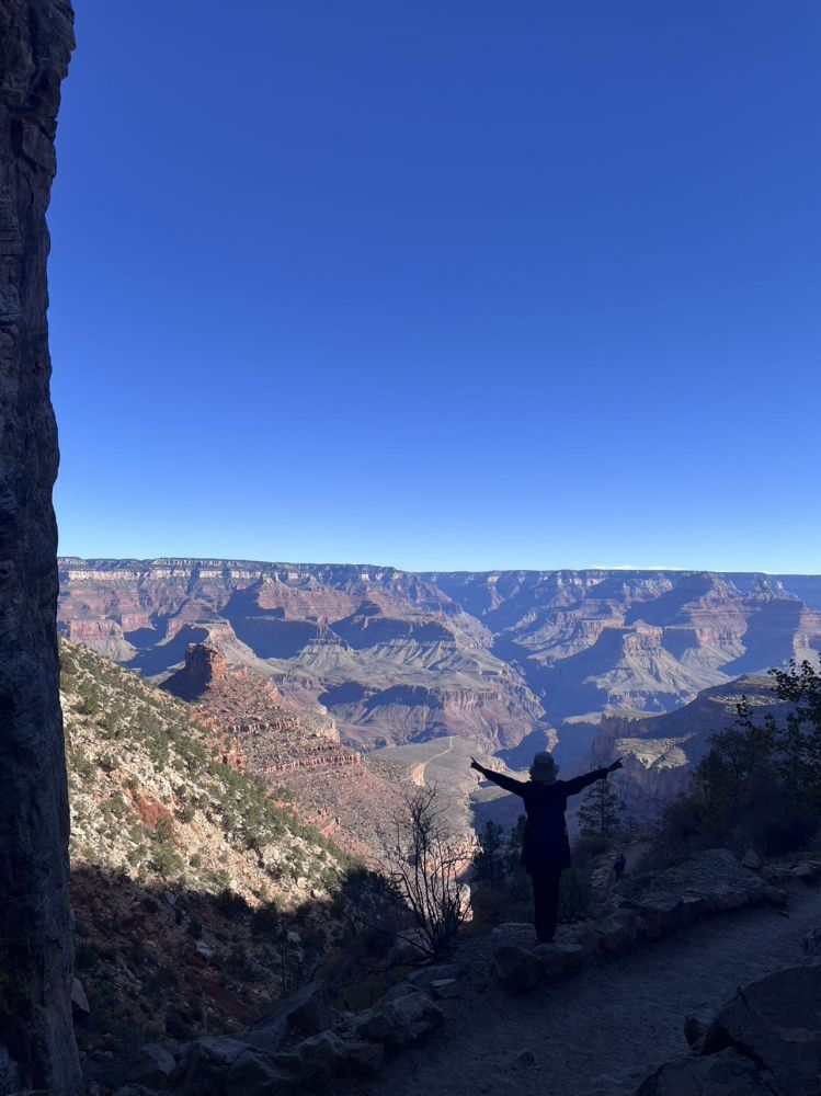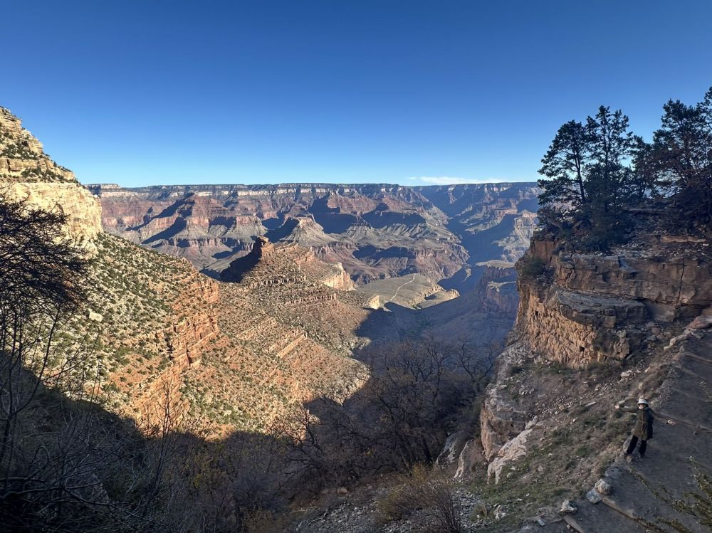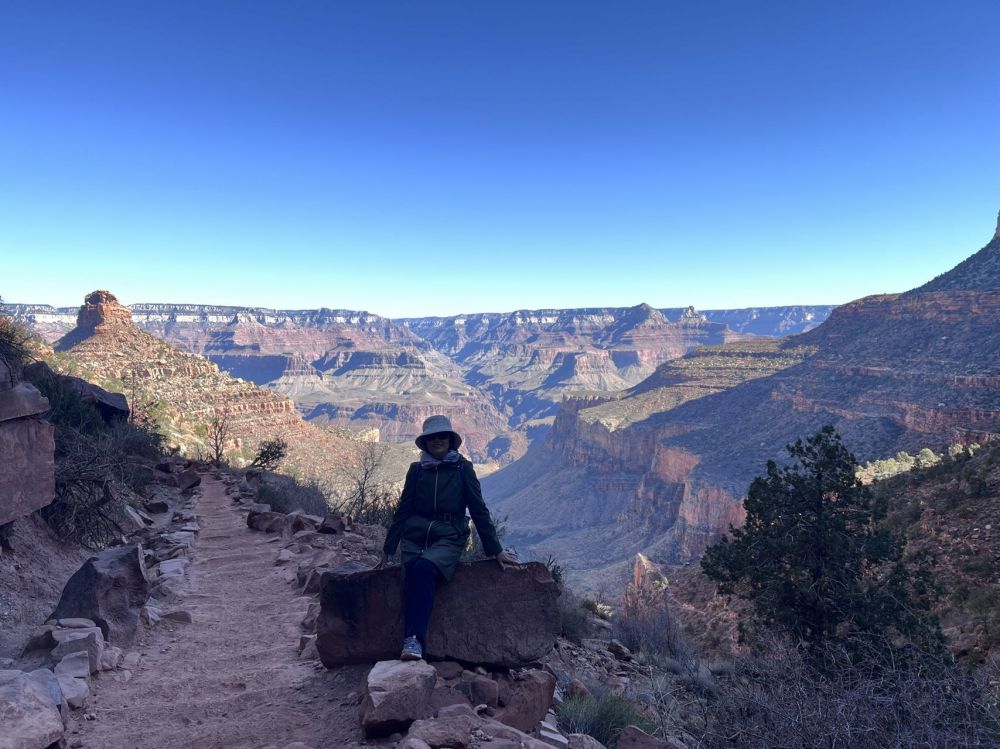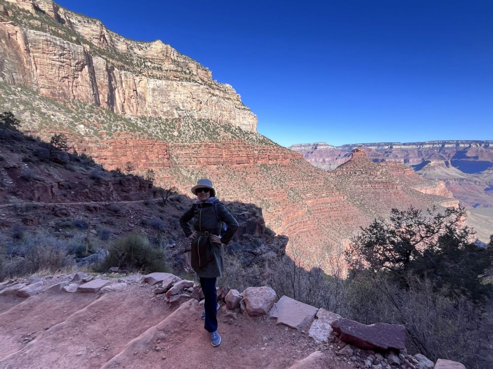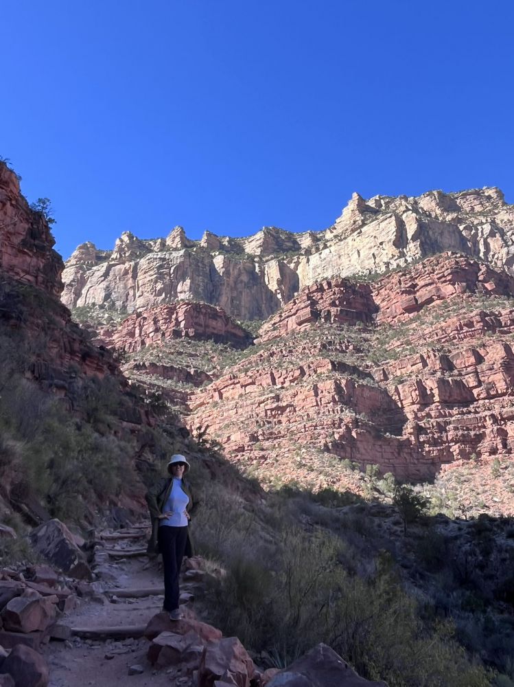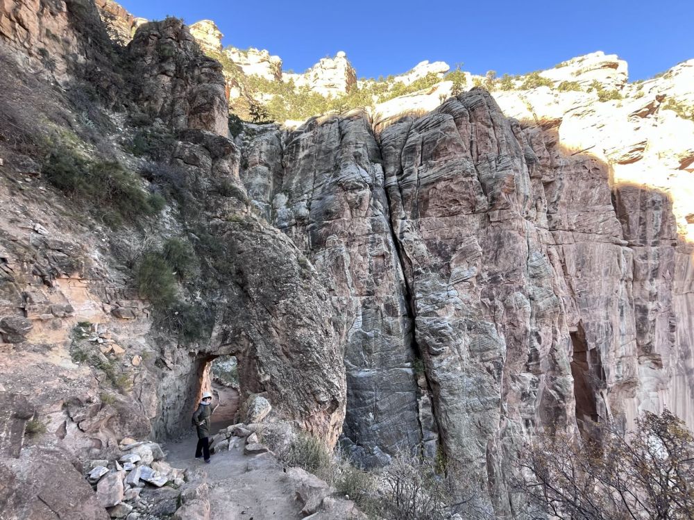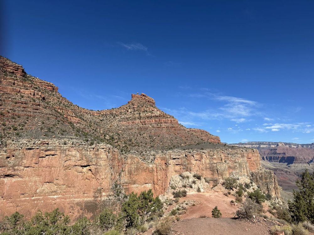 古人云:“欲穷千里目,更上一层楼。”如果同一位诗人与大峡谷相遇会不会说:“欲探百里深谷,且下三里崎岖!”第一天,看罢日出,吃完早餐,咱们完成了Bridget Angel Trail的三英里trail,a tremendous milestone!这基本上是徒步素人可以走的极限了,往返6英里/10公里,下降海拔高度650米左右。