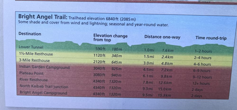 在这条步道上还碰到一对年纪和我们相仿的夫妻,男的有些啤酒肚,女人看着也不像徒步达人,他们背着的包也不大。就是这么一对看似普通的男女,人家凌晨3点钟就出发了,一路下到峡谷深处的Indian Garden,看日出,再返回,共9英里/14.5公里,哇!
