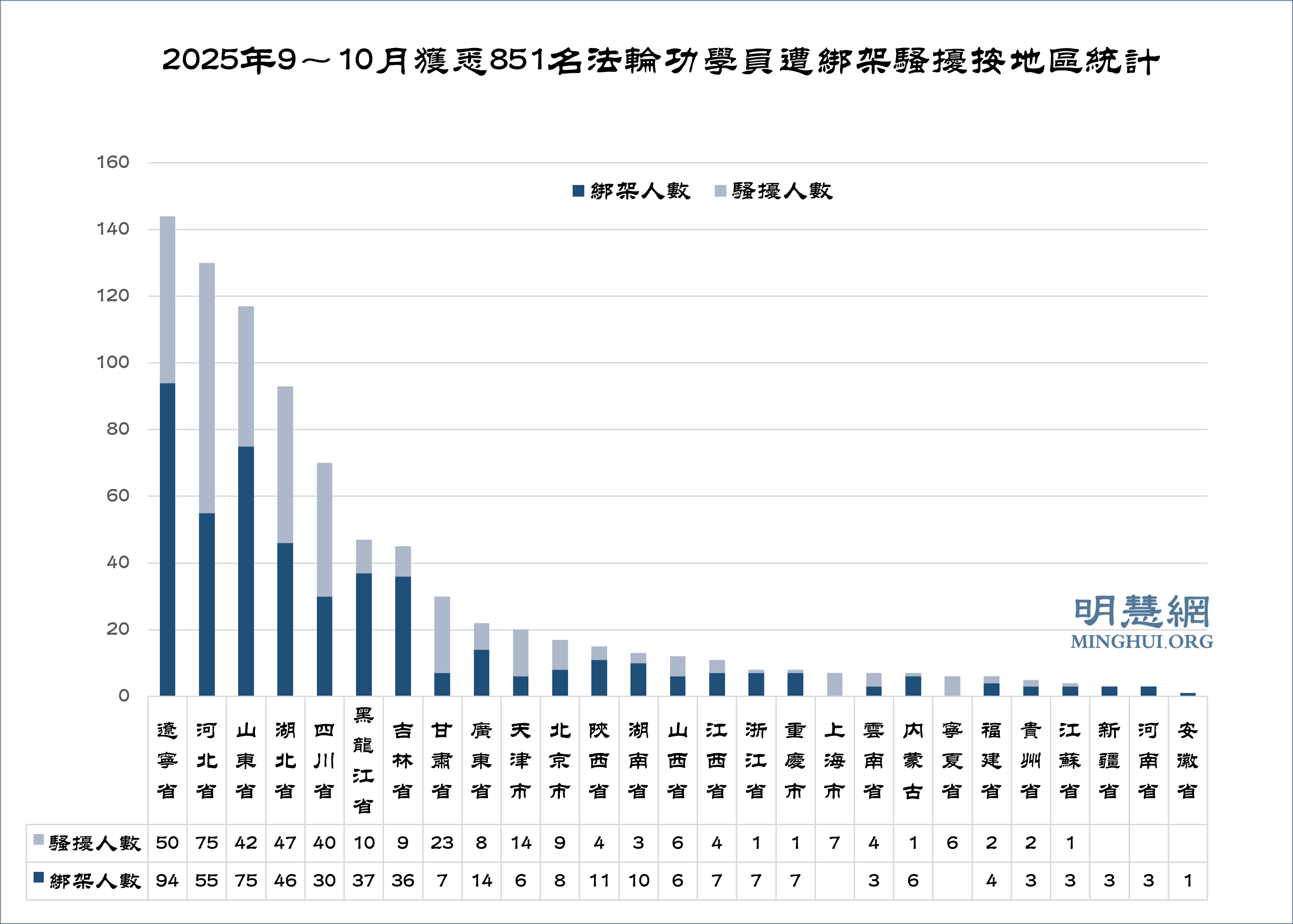 明慧网9月至10月份获知,至少851名法轮功学员遭绑架骚扰,其中482人被绑架,369人遭骚扰。