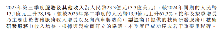 财报显示,公司第三季度服务及其他收入为23.3亿元人民币,同比增长78.1%,环比增长67.3%。这主要得益于售后服务收入增长,以及向汽车制造商提供技术研发服务的收入增长。