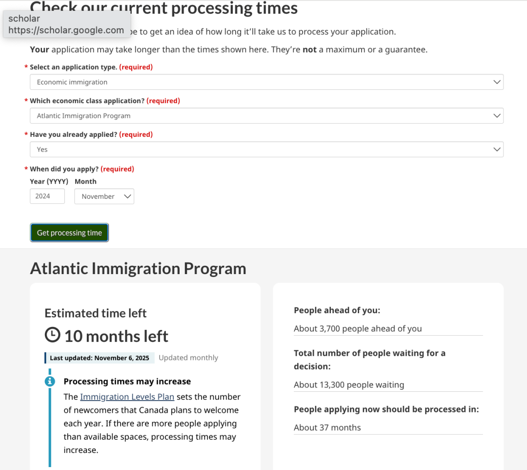 但其实我上IRCC官网查了一下,审批的时间并没有缩短,对于新的申请人来说,还是37个月。但是对于已经递交申请的人来说,似乎是缩短了。一个月前,我在尝试查询2024年11月递交申请的人的时间线的时候,预计的审批时间是17个月。但是现在再查,这个时间就变成了10个月,大大缩短了7个月。