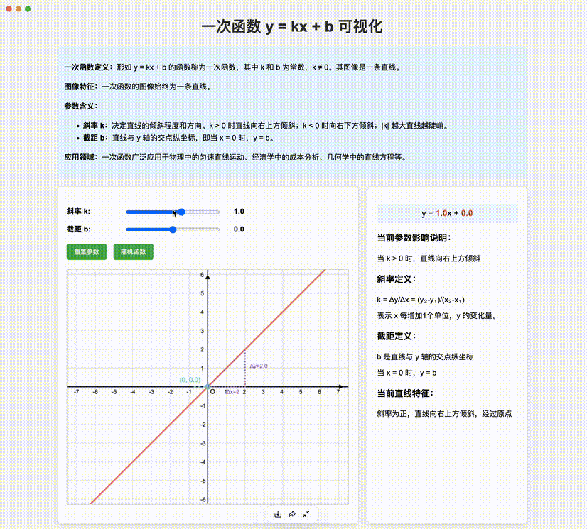 比如,下边这个“一次函数可视化”应用,通过调节k和b,一眼就能看出对函数图像的改变。