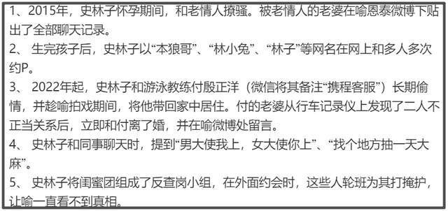 更严重的是,从2022年起,史林子与游泳教练付殷正洋(在其微信中被备注为“携程客服”)发展了长期不正当关系。她常趁喻恩泰在外拍戏,将对方带回家中居住。此事最终被教练妻子发现并导致其离婚,据称,教练的前妻还曾留言将此事告知喻恩泰。