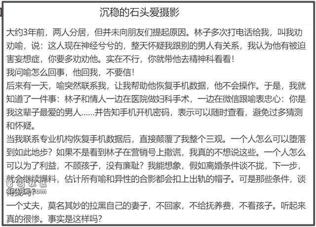 然而,剧情在11月18日发生颠覆。一位自称双方共同好友、账号名为“沉稳的石头爱摄影”的用户发布长文,直指史林子长期婚内出轨,并罗列了多项具体证据: