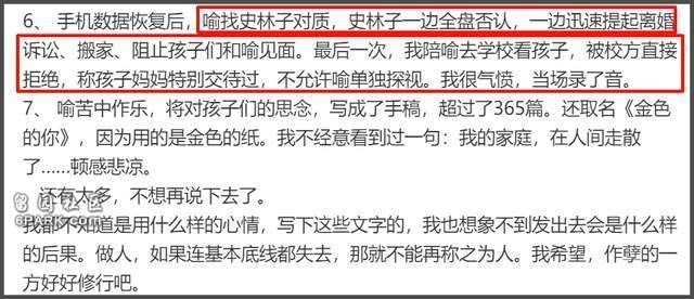 该好友进一步陈述,称喻恩泰是在恢复旧手机数据后,才掌握了这些出轨证据。而史林子则在喻恩泰掌握证据后,迅速提起了离婚诉讼、立即搬家并阻止喻恩泰探视子女。好友透露,孩子所在学校以“母亲特别要求”为由,拒绝了喻恩泰单独见孩子的请求,相关对话已被录音存证。