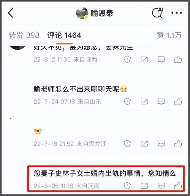 从好友的博文能看出来,喻恩泰和老婆分居闹婚变,史林子“恶人先告状”,找到石头想调解夫妻关系。还怀疑喻恩泰有被害妄想症,整天怀疑老婆和别人有关系,让朋友带他去精神科,而喻恩泰则回复石头,让他别信史林子。