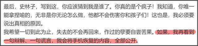 此前狗仔爆料喻恩泰婚变一事给喻恩泰的名誉造成不小影响,而石头表示他还有证据没有拿出来,他喊话史林子如果再辩解撒谎,那他会把手机内容全部公开,疑似还掌握史林子的其他证据。