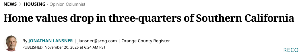对南加州的购房者来说,这是一个好消息:数据显示,过去一年,本地约四分之三的房产价值出现下跌。