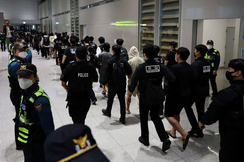 10月,警方押送涉嫌在柬埔寨网络诈骗中心工作的韩国人抵达首尔仁川机场。 Kim Hong-Ji/Reuters
